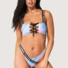 Make a splash in this sultry bikini featuring triangle cups, halter straps, gold chain detailing, a tie back closure, and matching bottoms with an adjustable waistband, gold chain accents, and a cheeky cut scrunch back.