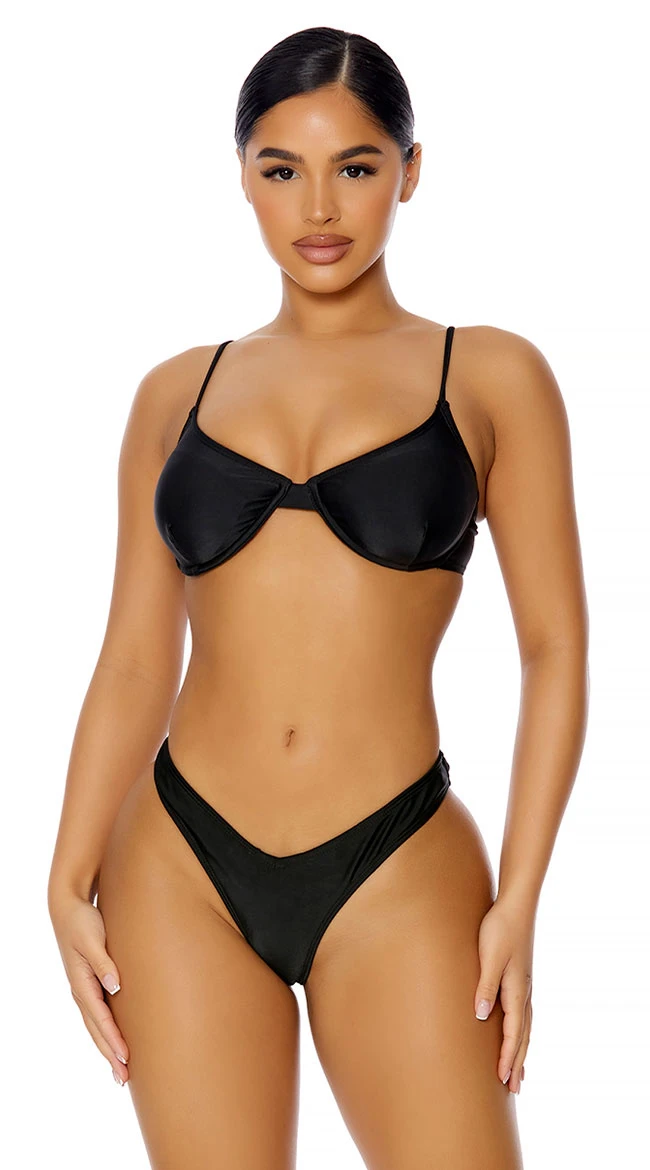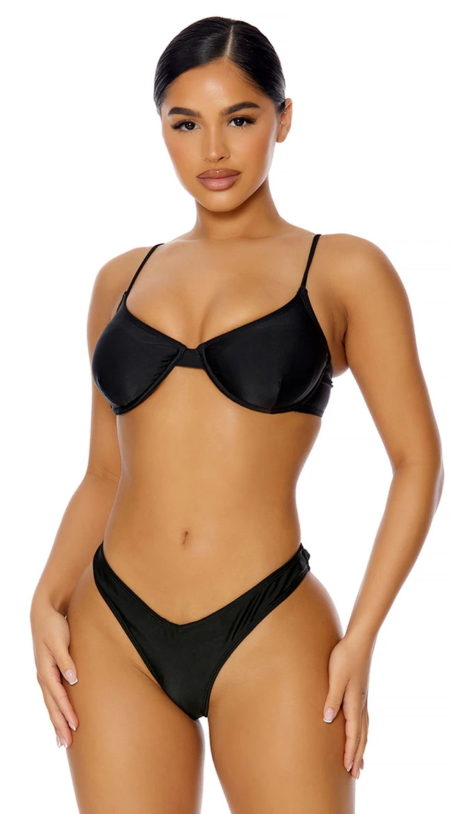 Keep your beachwear vibe sexy and chic in this provocative bikini featuring underwire cups, adjustable spaghetti straps, a hook and eye back closure, and matching V-cut bottoms with a high leg and a cheeky cut back.