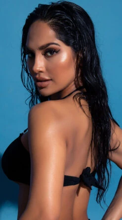 Imagine what’s beneath in this ultra sexy exclusive bikini top featuring a strapless bandeau style with removable halter straps, a sheer mesh front panel, and a tie back closure.
