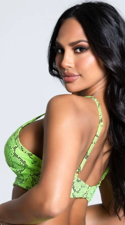 Sneak your way into the sunlight in this ultra sassy exclusive bikini top featuring adjustable triangle cups, a metallic snake print, halter ties, and a tie back closure.
